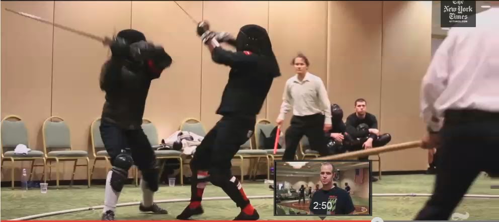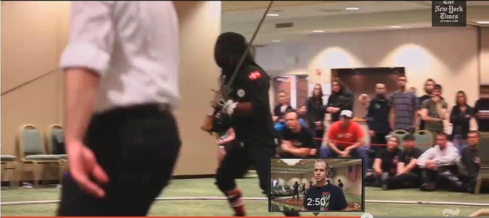 We’ll pick up the action at roughly 2:46, where one of the featured interviewees ( Turns out it’s +Jake Norwood, HEMA fighter and author of The Riddle of Steel roleplaying game!) is talking about how points are scored. The real action picks up a few seconds later, with the red-socked fighter closing, and then starting the exchange.